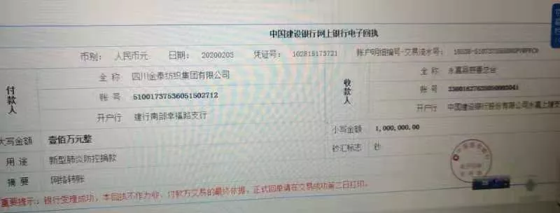 上午10時(shí)許,永嘉縣慈善總會(huì)收到了一筆特殊的網(wǎng)絡(luò)轉(zhuǎn)賬,記者在中國(guó)建設(shè)銀行網(wǎng)上銀行電子回折單上看到,付款人是四川金泰紡織集團(tuán)有限公司,用途上寫著新型肺炎防控捐款,金額為一百萬元整。據(jù)永嘉縣慈善總會(huì)介紹,這筆捐款也是目前我縣收到的單筆最高捐款。